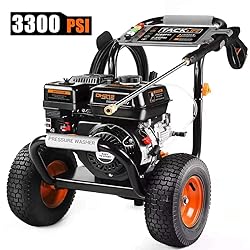 This pressure washer is another powerful equipment that boasts of a combination of a super pump and copper motor that offer a maximum of 3300 PSI at 2.6 GPM. This high-pressure equipment will help you easily, quickly and efficiently clean up your roofs, farm equipment, trucks, walls, garages and yards. It is equipped with a large gas tank of 3.6 liters for longer operation and soap tank of 3.8 liters for production of foam. A pressure hose of 3 layers guarantees safety and longevity.